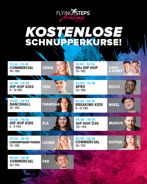 Regelmäßig treten wir weltweit mit unseren bekannten Shows wie z.B. Flying Bach auf großen Bühnen auf.BUCHE JEDE CLASS GANZ EINFACH ÜBER UNSERE FLYING STEPS ACADEMY APP