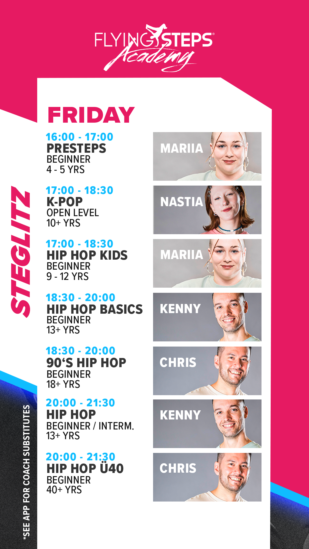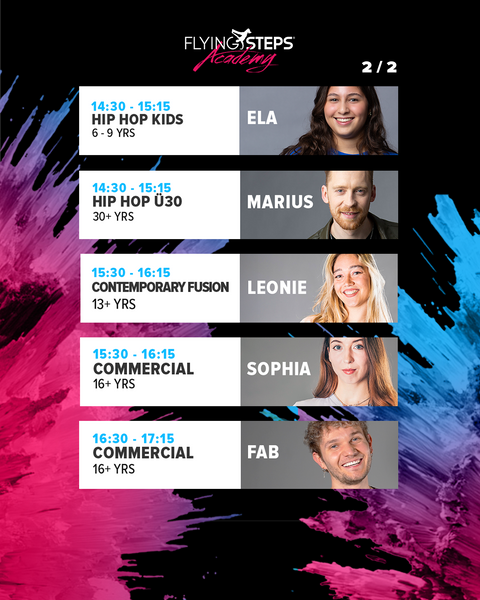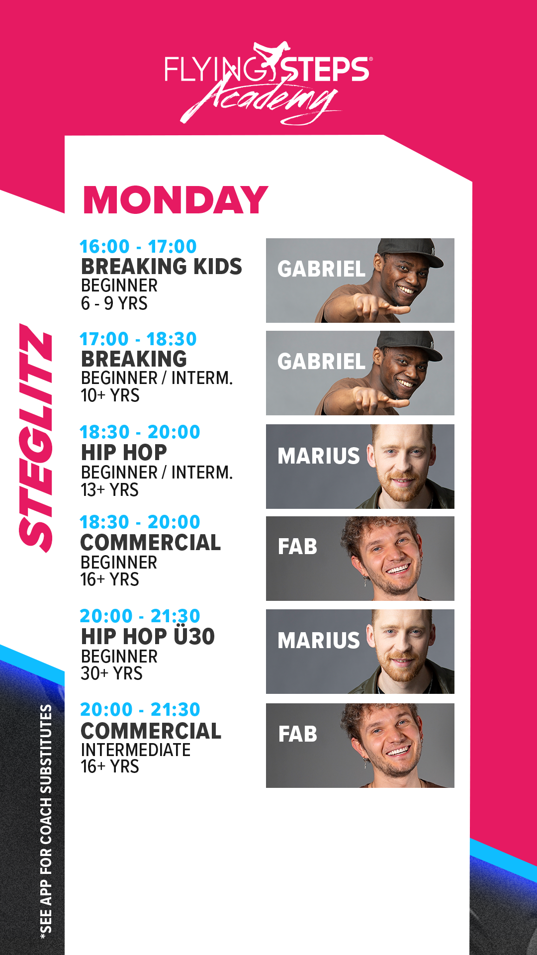 Kontakt E-Mail: fsa-steglitz@flyingsteps.com Telefon: 030 40006189 Öffnungszeiten Montag - Freitag: 10:00 - 21:30 Uhr Samstag: 11:30 - 17:00 Uhr